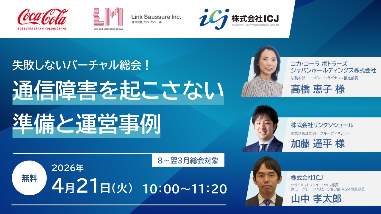 開催終了 2026年4月21日(火)10:00〜11:20 <8~翌3月総会対象>失敗しないバーチャル総会!通信障害を起こさない準備と運営事例【コカ・コーラBJH×リンクソシュール×ICJ】 詳細を見る